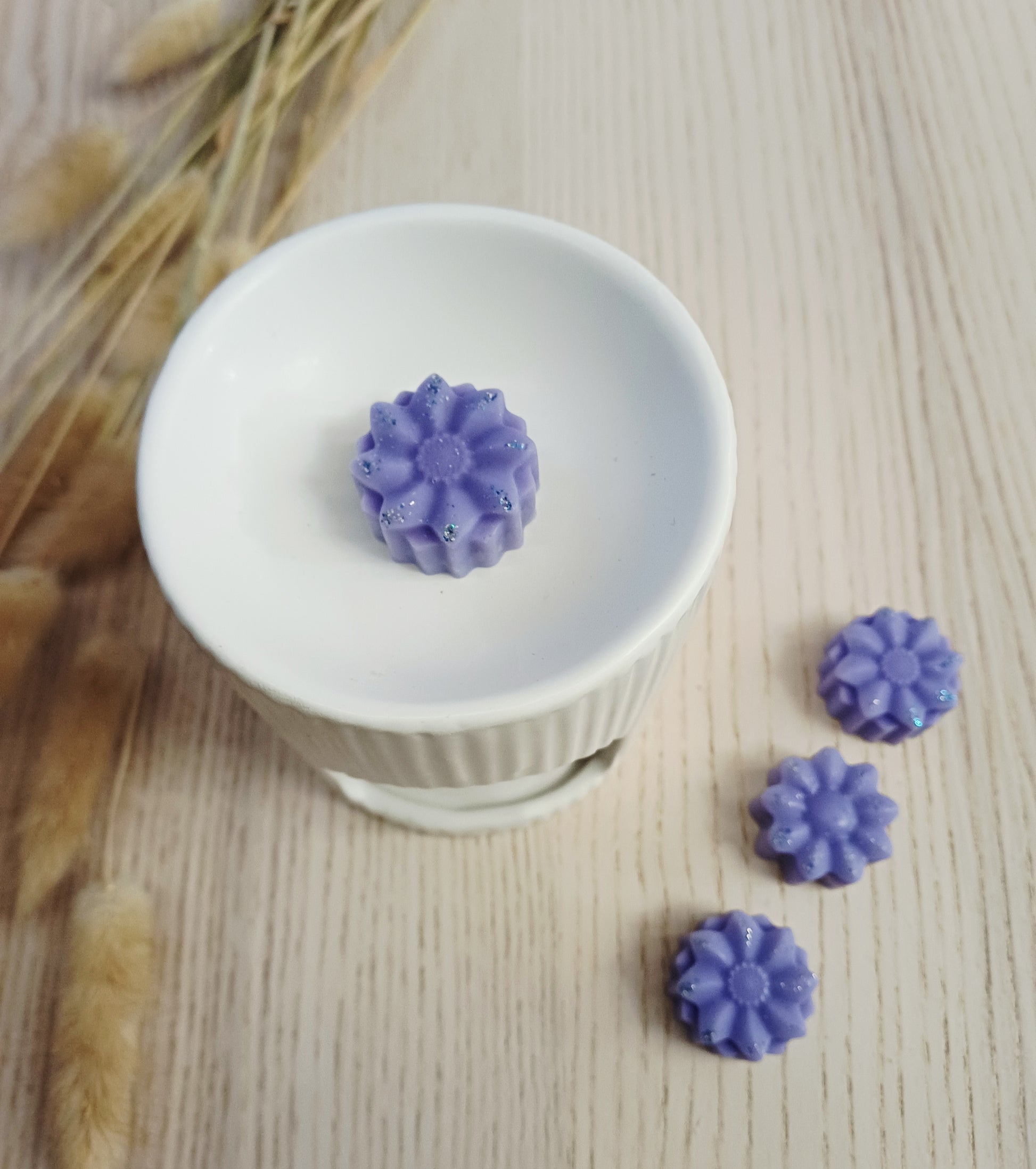 Composition : cire végétale de soja, parfum Cockrail Japonais certifié IFRA, colorant mica violet, paillettes.