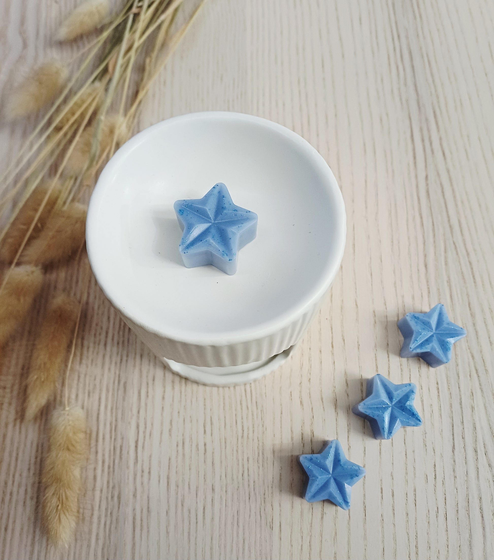 Composition : cire végétale de soja, parfum Musty certifié IFRA, colorant mica bleu, paillettes.